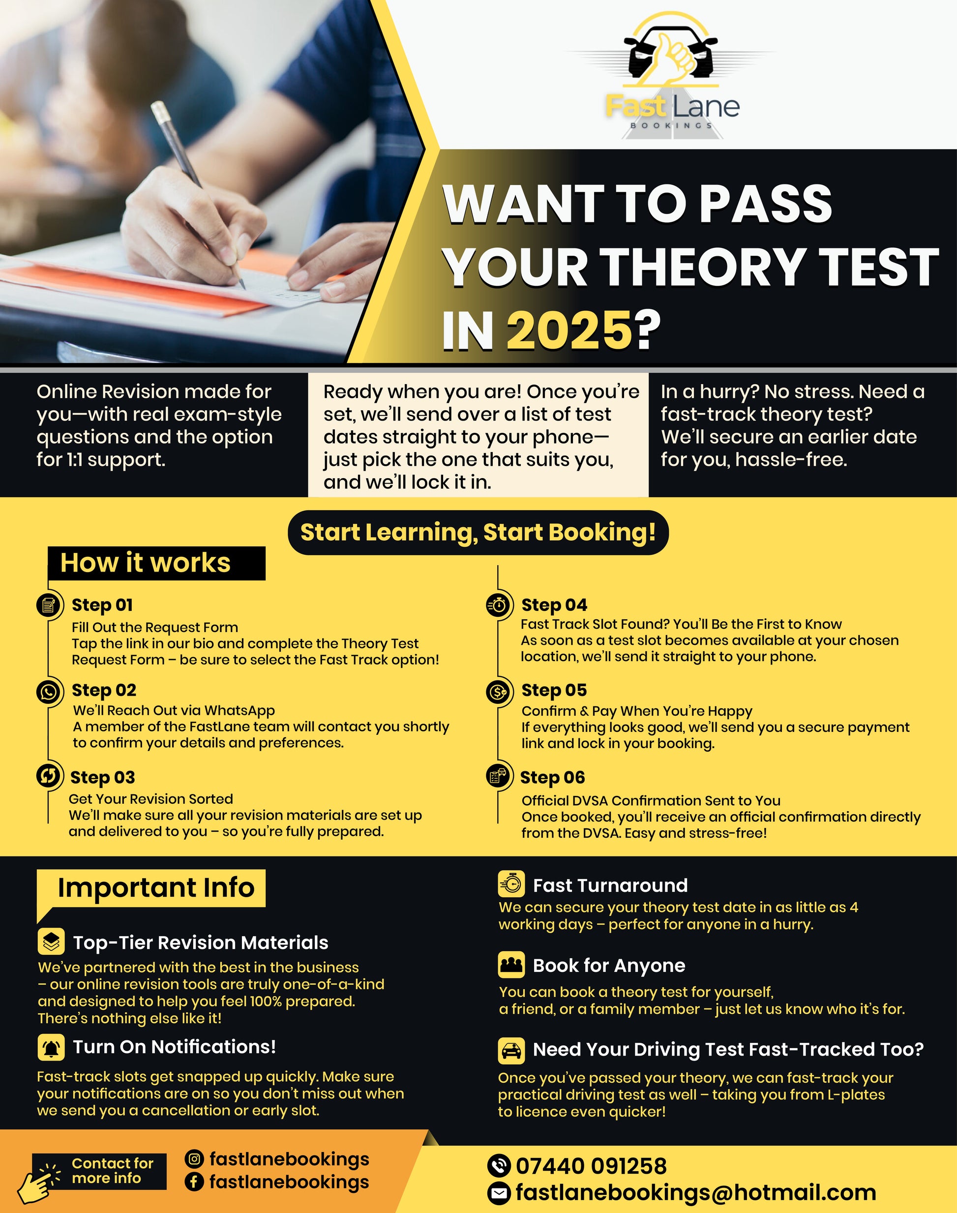When you use FastLaneBookings to secure your preferred DVSA Theory Test date and centre, please do not make another booking yourself or notify us of plans to do so.